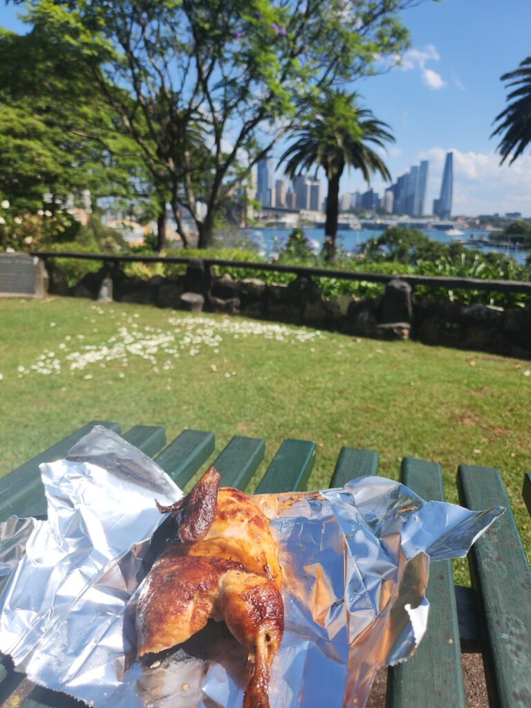 We ordered half a chicken to-go and started walking the streets of Sydney, looking for a place to eat. Our first steps into Sydney were filled with emotion. With every step, we enjoyed the clear weather and clear sky, and the smell of the chicken in our hands naturally drew us in, leading us to a quick and easy meal.