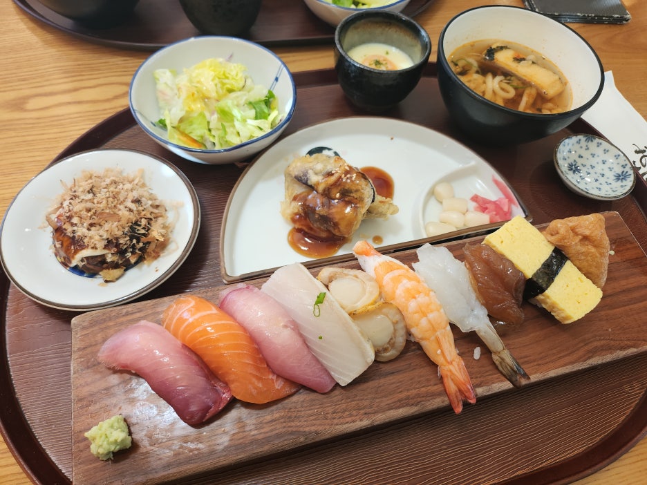 저희가 동촌 유원지 맛집 스시센슈를 이용할 때는 런치 세트를 주문했는데 런치 세트는 초밥 열 피스와 계란찜 샐러드 미니 오코미야키 그리고 가지로 만든 탕수육을 메뉴로 만나볼 수 있었습니다