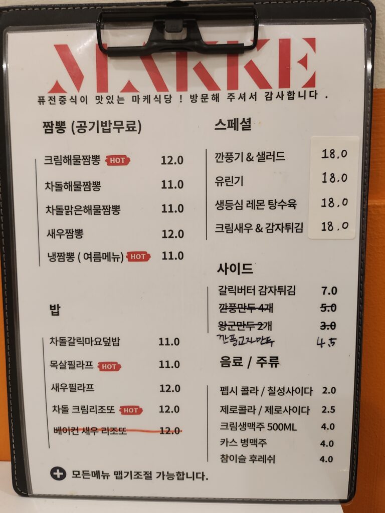 마케식당은 대표메뉴는 중국퓨전음식들로 크게는 짬뽕류, 밥류, 요리 등을 만나볼 수 있는데요, 개별메뉴 같은 경우 주변 중식당보다는 퓨전중식이기에 가격대가 있는 편이지만 요리류에 이르러서는 좀 더 이용하기 좋은 가격대가 형성되어 있었고, 공기밥이 무료라는 점과 맵기를 조절 가능하다고 안내되어 있는 점이 마음에 들었습니다.