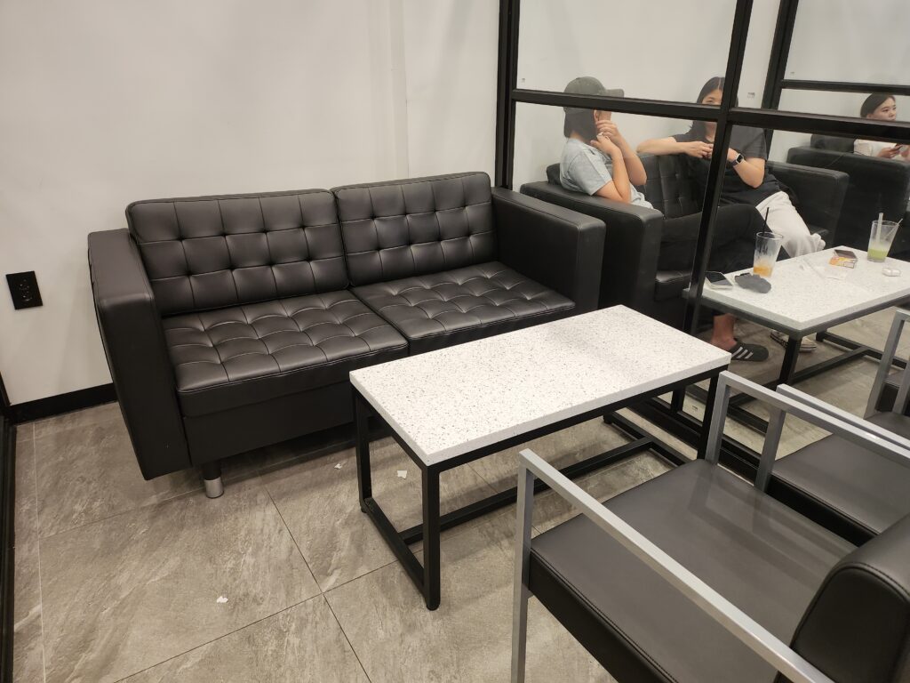 세 번째 자리는 저희가 가장 매력 넘친다고 생각했던 자리인데요, 자리는 소파의 푹신함을 온전히 받을 수 있는 것은 물론 유리막으로 룸 처럼 되어있어서 소리가 새어 나가는 일도 적고 편안하게 자리를 온전히 이용 할 수 있다는 것이 매력적이었습니다.