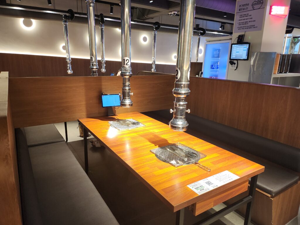 식당 내부는 4명이 앉기 좋은 테이블로 되어있으며 각 테이블엔 키오스크, 연기배출구 등을 통해 편한 주문과 이용이 가능하게 되어있어서 마음에 들었고, 쿠션감이 좋은 의자를 이용하면서 식사를 하는 내내 편안하게 식사를 할 수 있다는 것도 장점이었습니다.
