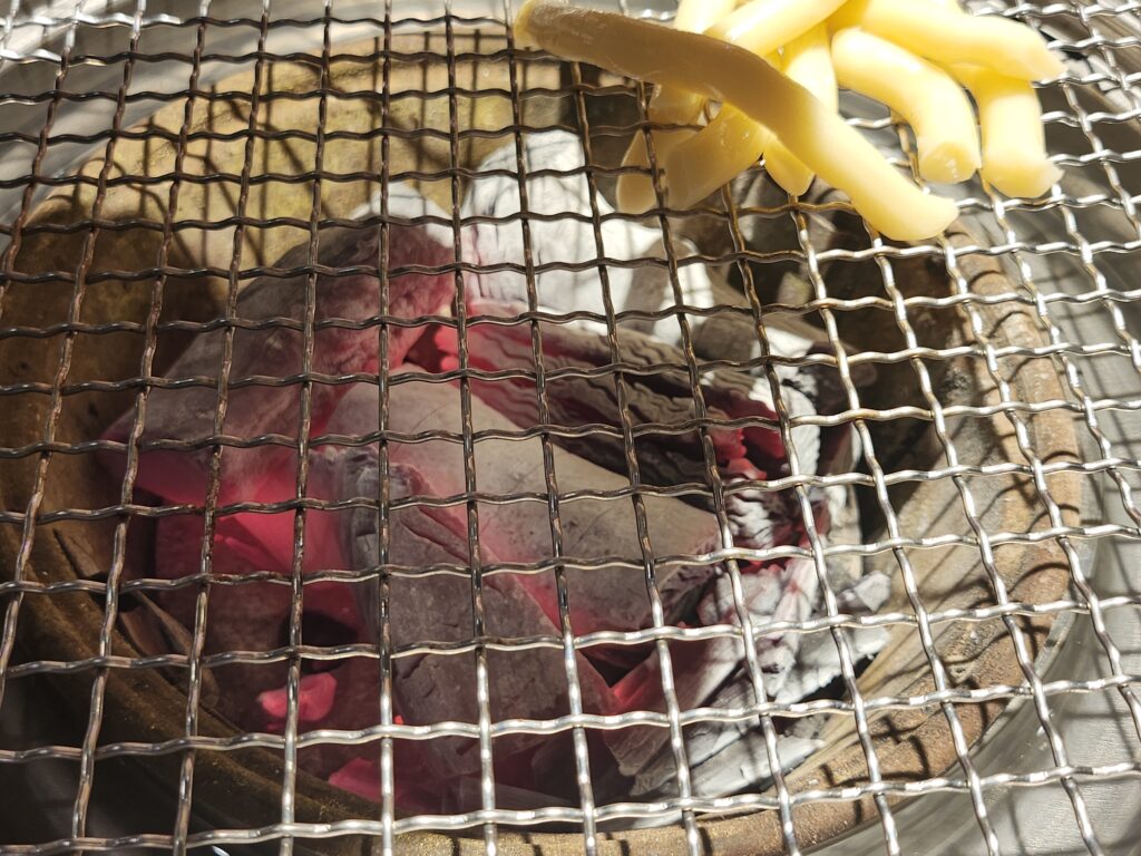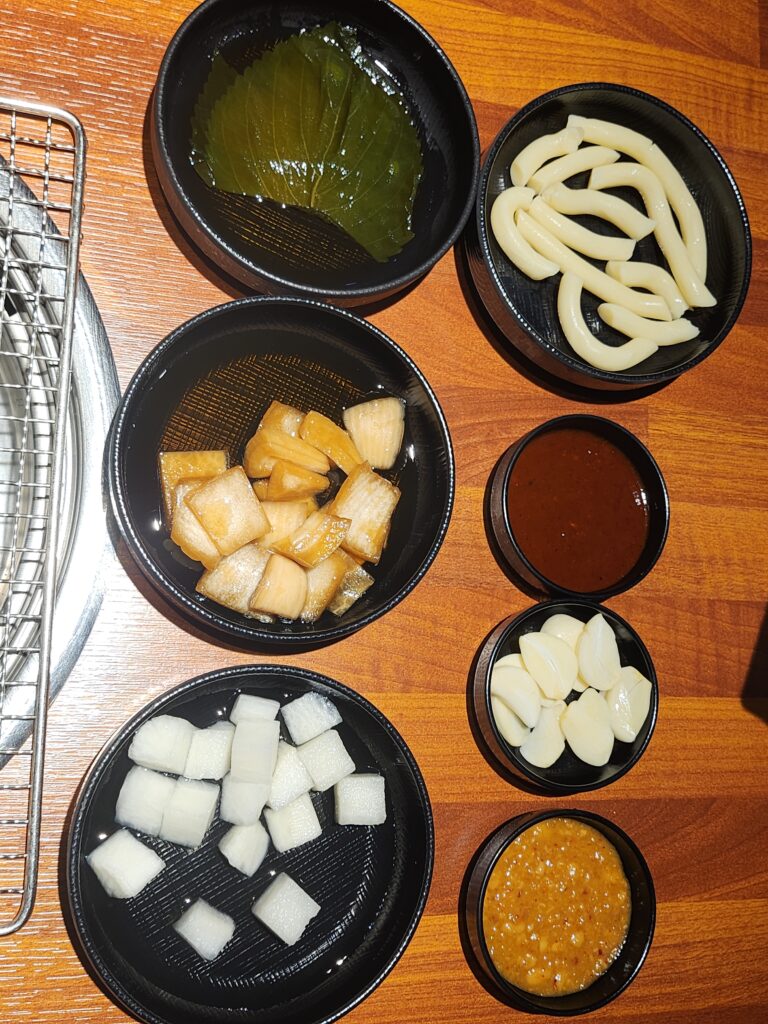 식사를 하기 전 밑반찬은 간단하게 치킨무, 김치, 깻잎 등의 반찬이 나오는데, 처음에 나오는 떡의 경우 무료로 계속 이용할 수 있어서 숯이 나오는 순간부터 자유롭게 구워먹으며 추가를 해 먹을 수 있어서 좋았습니다.