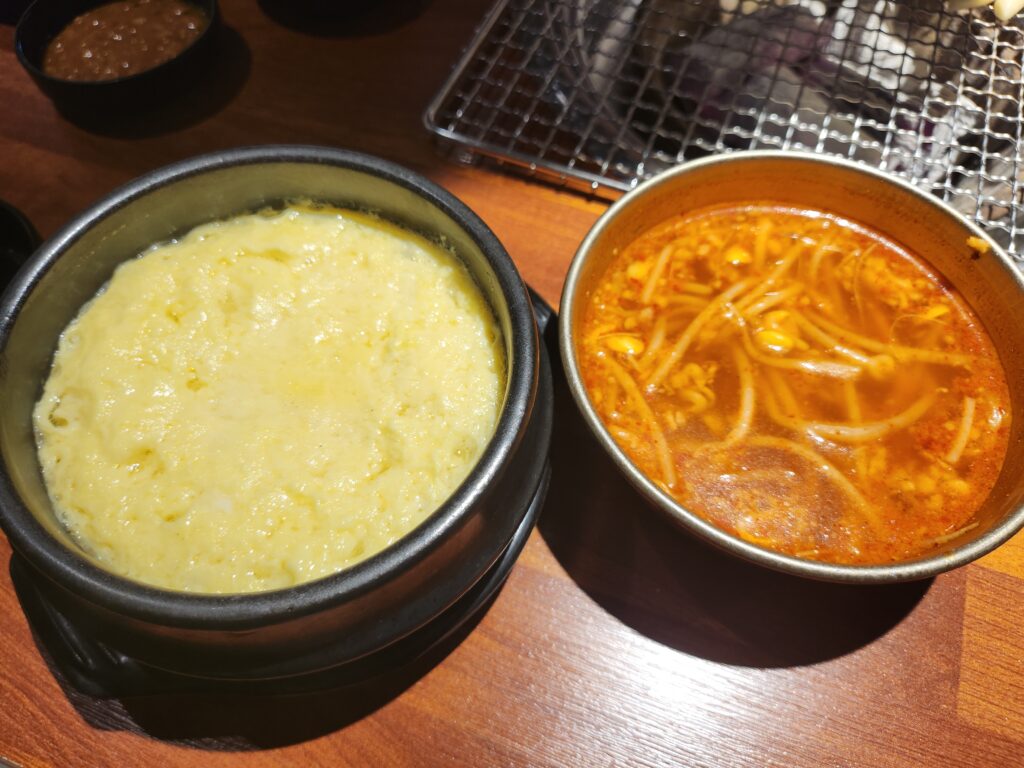 숯과 석쇠가 나오고 나서는 1인당 하나씩 계란찜과 콩나물국을 기본 상차림으로 주는데, 두 용기 다 열이 잘 전달되는 용기기 때문에 열이 있는 상태에서 손이 닿지 않게 조심하며 먹어야 했습니다.