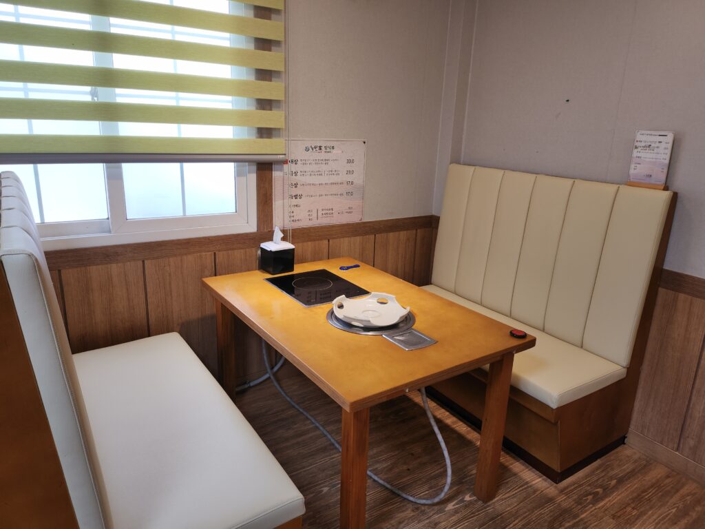 테이블은 기본적으로 미리 나온 반찬들이 식지 않게 열을 지속적으로 공급해주는 장치와 인덕션으로 구성되어있어서 식사를 하는 내내 따듯한 반찬과 국을 즐길 수 있고, 테이블에 붙어있는 벨을 통해서 원하는 메뉴를 바로 주문할 수 있다는 것이 좋았습니다.