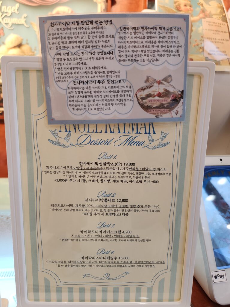 카운터 밑에 있는 쇼케이스에는 제주에서 볼 수 있는 다양한 재료로 하여금 카이막을 만든 모습을 볼 수 있는데요, 말차, 한라봉, 우도의 땅콩 , 옥수수, 치즈 같은 다양한 맛의 카이막을 만나볼 수 있기 때문에 사람들이 제주도를 여행오며 천사카이막을 그냥 지나칠 수 없는 것 같다는 생각이 들기도 했습니다.