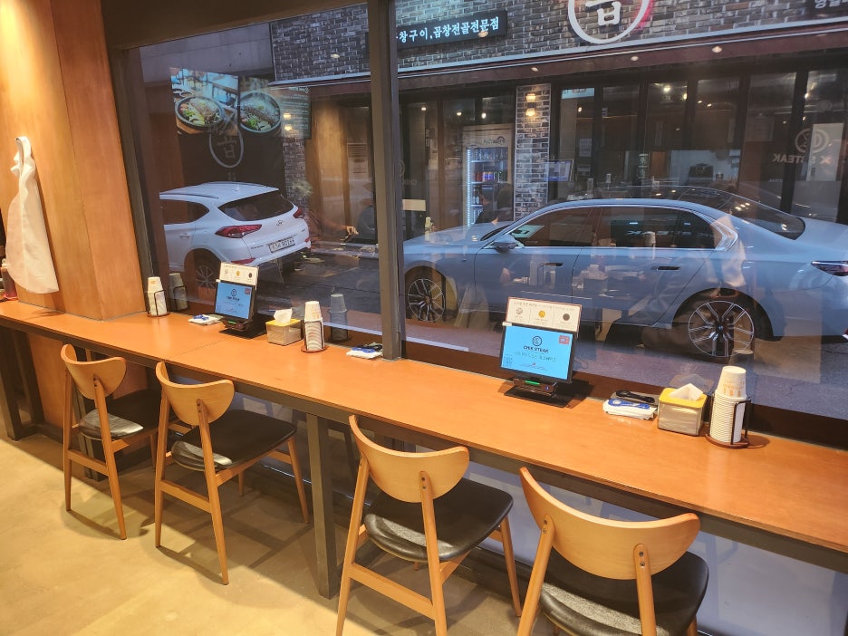 혼자 방문하거나 자리가 없을 때 이용할 것 같은 이 바 형태 테이블은 부담 없이 편하게 이용할 수 있어서. 혼자 방문한 사람들에게 정말 나 왜 속들은 테이블의 형태였는데요.