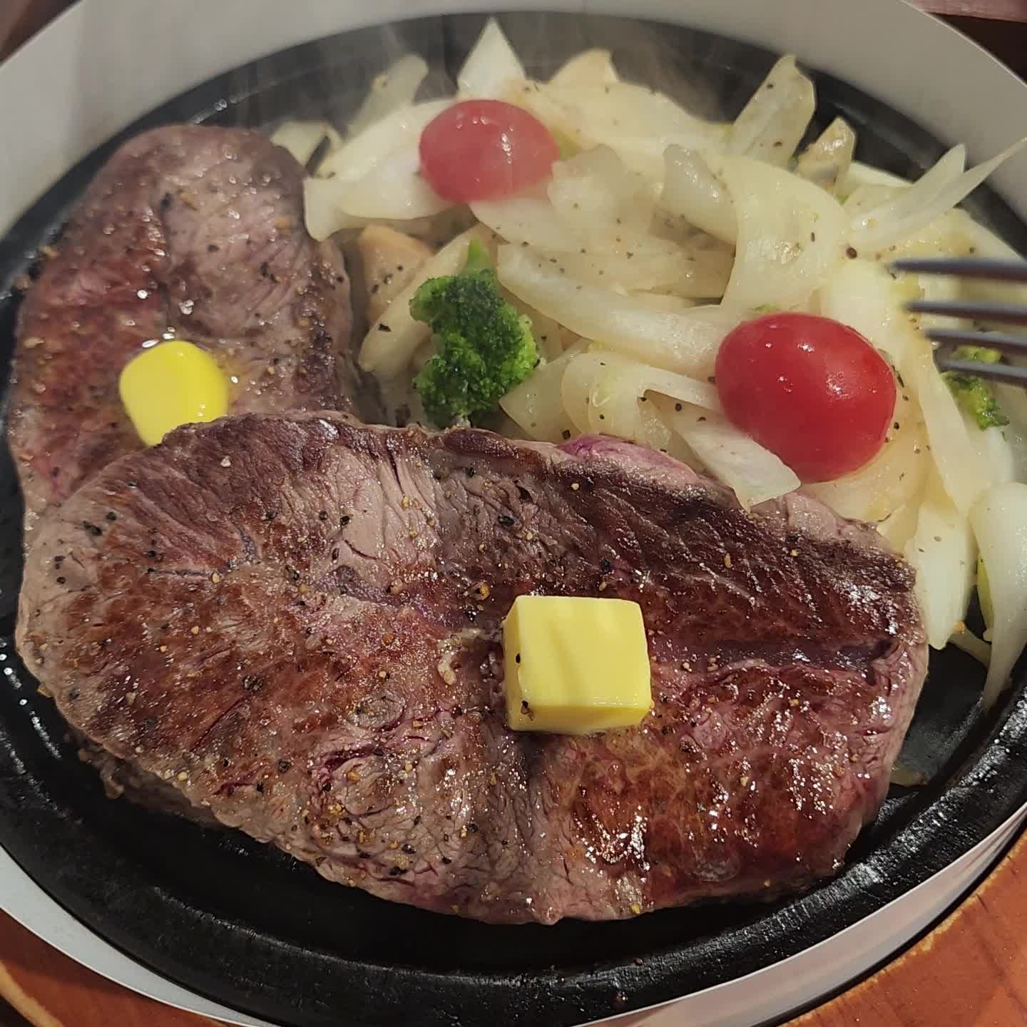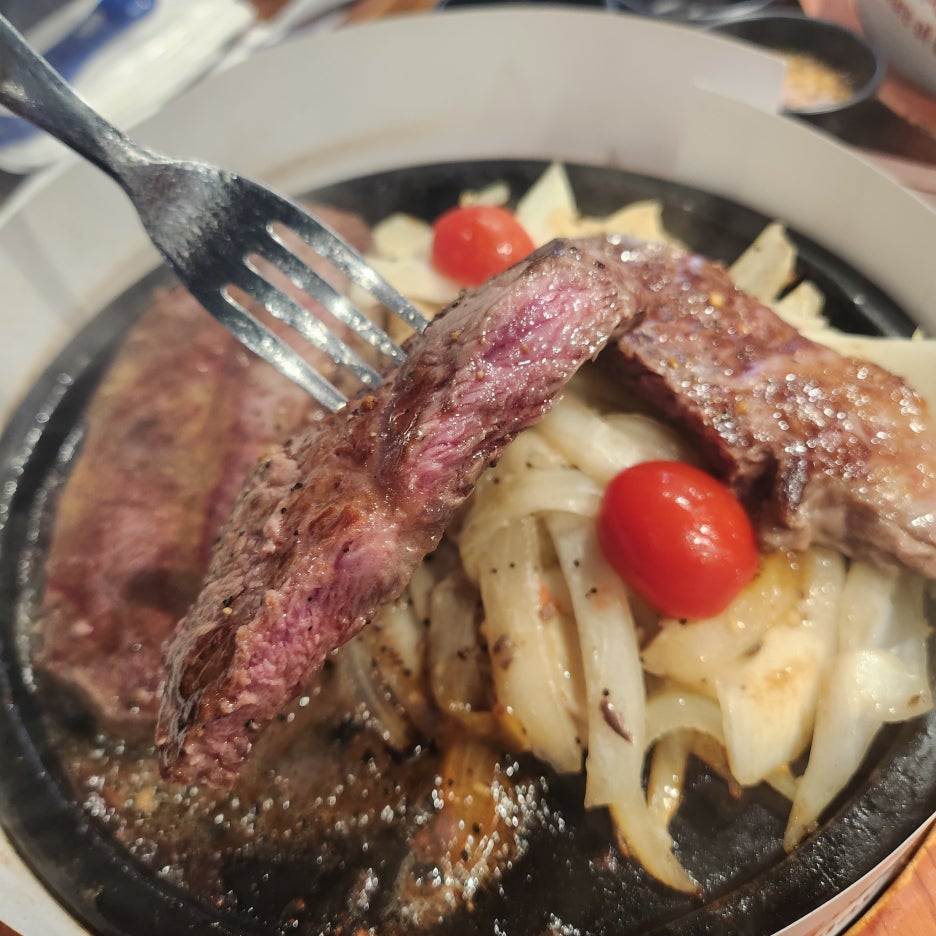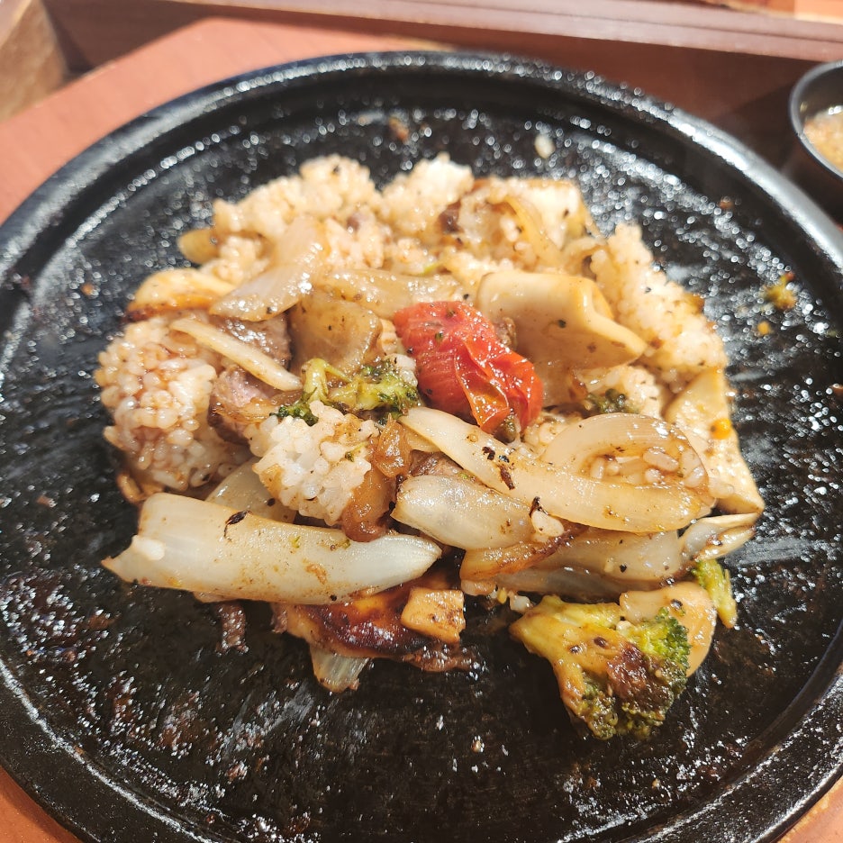 처음에는 스테이크를 먹는데 무슨 고기가 필요하나 생각을 하기도 했지만 고기 자체가 상당히 부드러운 편이었고 야채와 밥 그리고 스테이크 소스를 돌판 위에서 함께 섞어먹자 잘 만들어진 스테이크 덮밥을 먹는 듯한 기분을 느낄 수 있기도 했습니다.