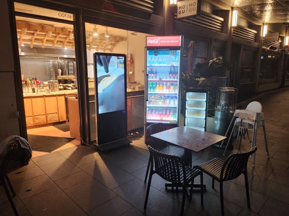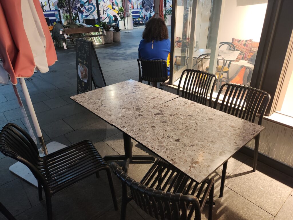 The indoor tables are ideal for two people, while the outdoor tables can accommodate four or more. Considering the luggage I’ll be carrying around while traveling, I felt it would be a good idea to sit outside. If it’s cold or rainy, you’ll have no choice but to take an inside table, but if an outside table is available, I highly recommend it.