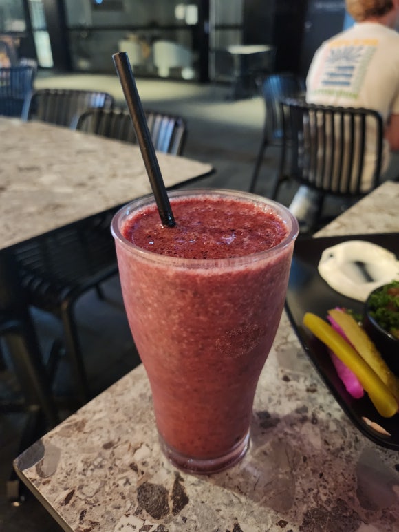 This drink, called Berry Town, had a texture reminiscent of fresh fruit and a rich, voluminous flavor. It was a smooth drink, blending various fruits, vanilla, and juice.