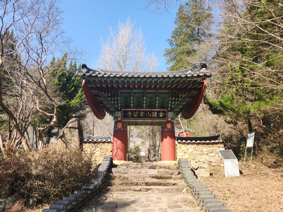 약 5분에서 10여분을 걷자 금전사에 입구라고 할 수 있는 대문을 발견할 수 있었는데요. 이 문을 지나고 나면 작은 마을처럼 사찰이 조성되어 있으며 그 안에 벚꽃과 매화 등 다양한 꽃을 만날 수 있기에 걸으면은 느끼는 피로보다 기대감이 한껏 커지는 것을 느낄 수 있었습니다
