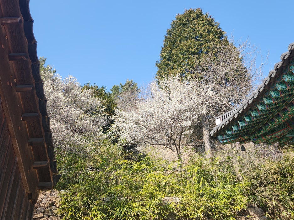마치 팝콘처럼 터져있는 매화의 모습을 바라보며 충분한 감성을 느낄 수도 있었고 산 위에 있는 사찰이라는 특성 덕분에 주변에 공기가 상당히 좋은 편이었고 마음을 힐링하기 위해서 방문하고 싶으신 분이 있다면 절대 후회하지 않을 것 같은 느낌이 들었습니다.