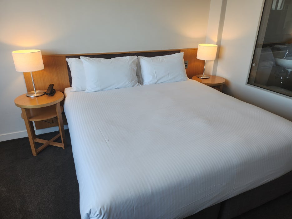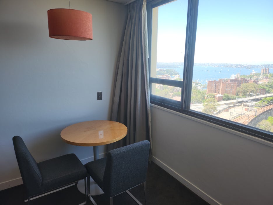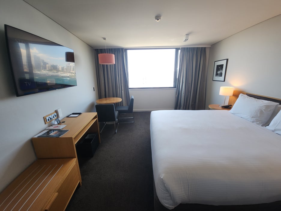 The View Sydney’s interior features a king-size bed, a dining table, and a large television. The room immediately felt remarkably clean. Since there aren’t any buildings larger than this hotel in the area, I booked it with the expectation that I’d get a great view. I was once again impressed by the room’s condition, which was even better than I expected.