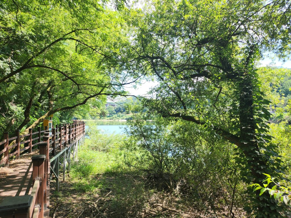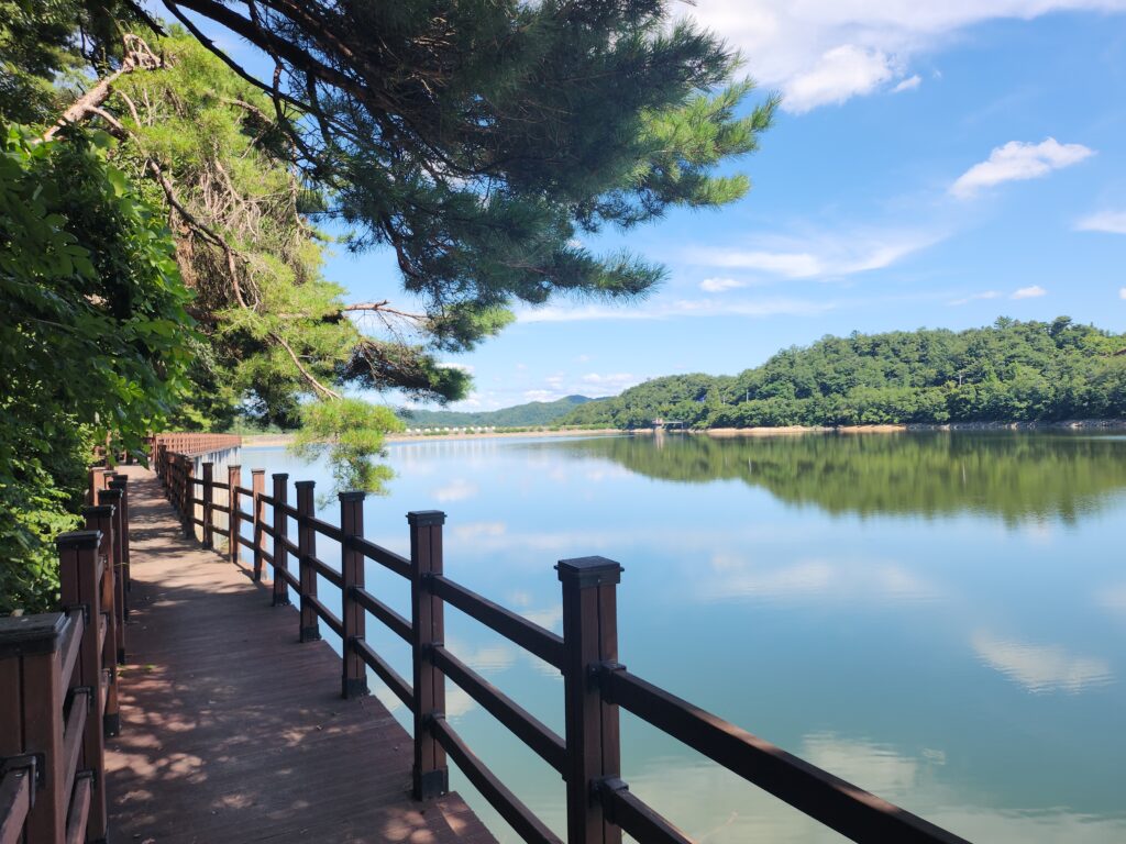 순흥저수지의 데크길은 중간중간 멋진 뷰를 볼 수 있는 장점과 더불어 데크길의 경로를 침범하는 나무나 생물이 없다는 것이 정말 매력적이었는데, 더울 때쯤에는 그늘이 나타나서 시원한 바람을 맞이할 수 있게 해주고 아름다운 자연을 바라볼 때 쯤에는 자연을 더욱 아름답게 느낄 수 있는 햇빛을 만끽할 수 있어서 정말 자연의 아름다움을 즐길 수 있는 길이라는 생각이 들었습니다.
