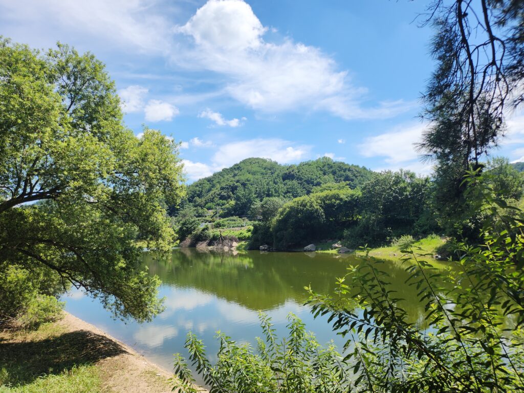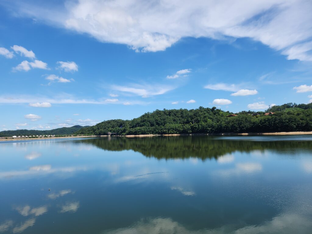 울창한 자연 사이로 중간중간 보이는 저수지의 모습은 마치 우유니소금사막을 보는 듯 한 감성을 느낄 수도 있었는데요, 푸른 하늘과 청량한 자연이 그대로 비치는 저수지의 모습은 보는 사람을 절로 즐겁게 하는 아름다움을 느낄 수 있었습니다.