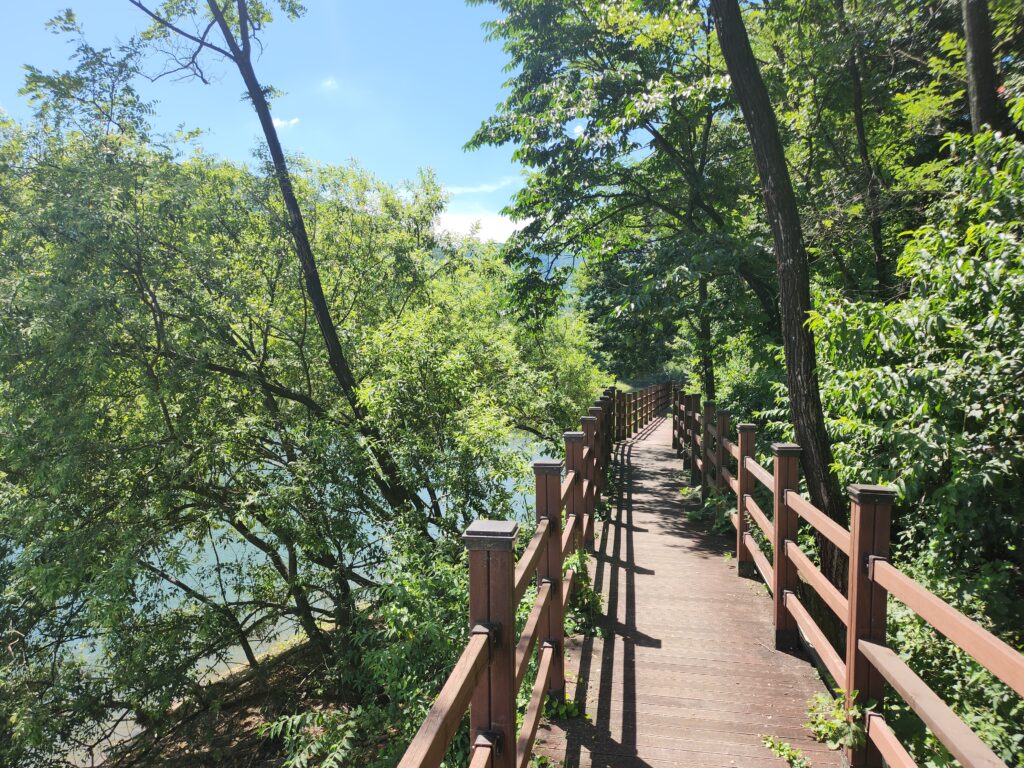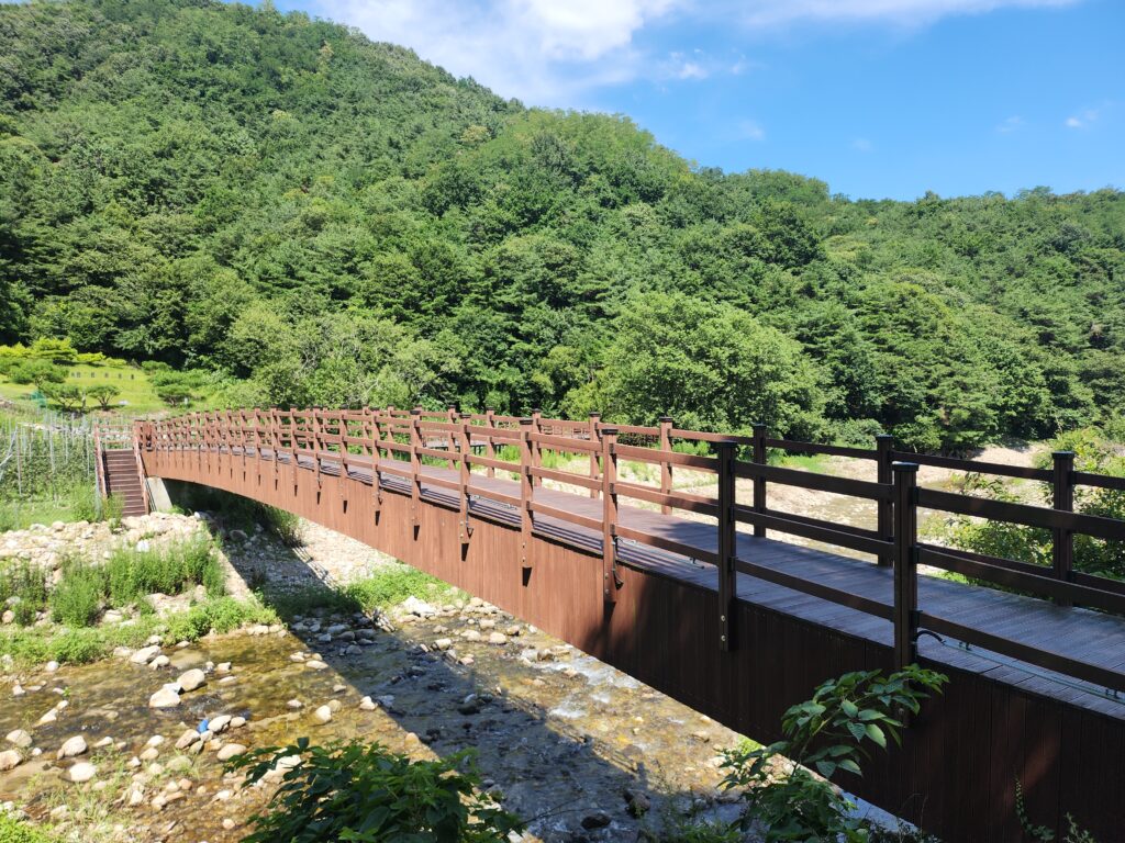 가는 길에는 이처럼 강줄기 위로 다리가 이어져 있는 것이 보이는데, 마음먹고 아래 강줄기에서 피서를 즐겨도 좋을 것 같다는 생각이 들기도 하는 시원함이 느껴지기도 했습니다. 다리를 지날 때까지는 햇살이 강한 편인데, 앞으로 갈 방향은 그늘로 되어있어서 햇빛이 강한 날에도 부담 없이 올 수 있을 것 같은 기분이 들었습니다.