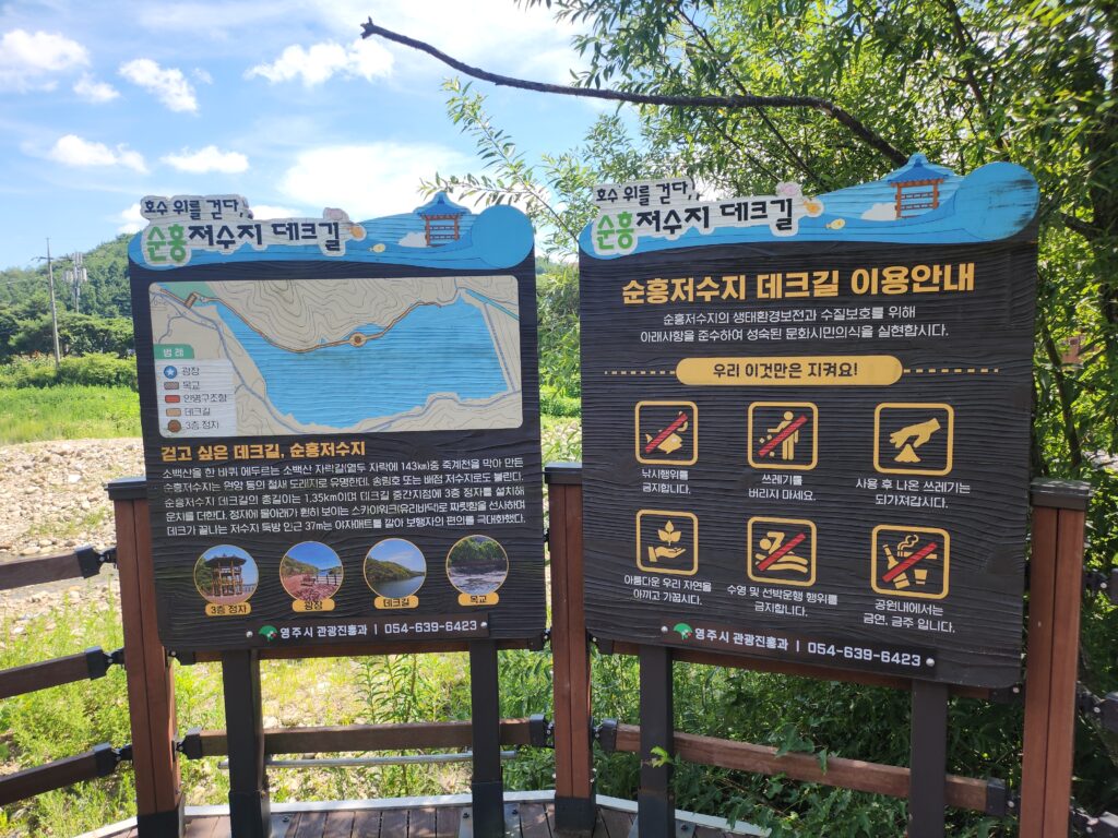 주차장에 주차하고 길을 따라 5분 정도를 천천히 내려가기 시작하면 데크길을 만날 수 있으며, 그 데크길을 따라가면 오늘 방문할 목적지인 순흥저수지의 입구를 만나볼 수 있습니다.