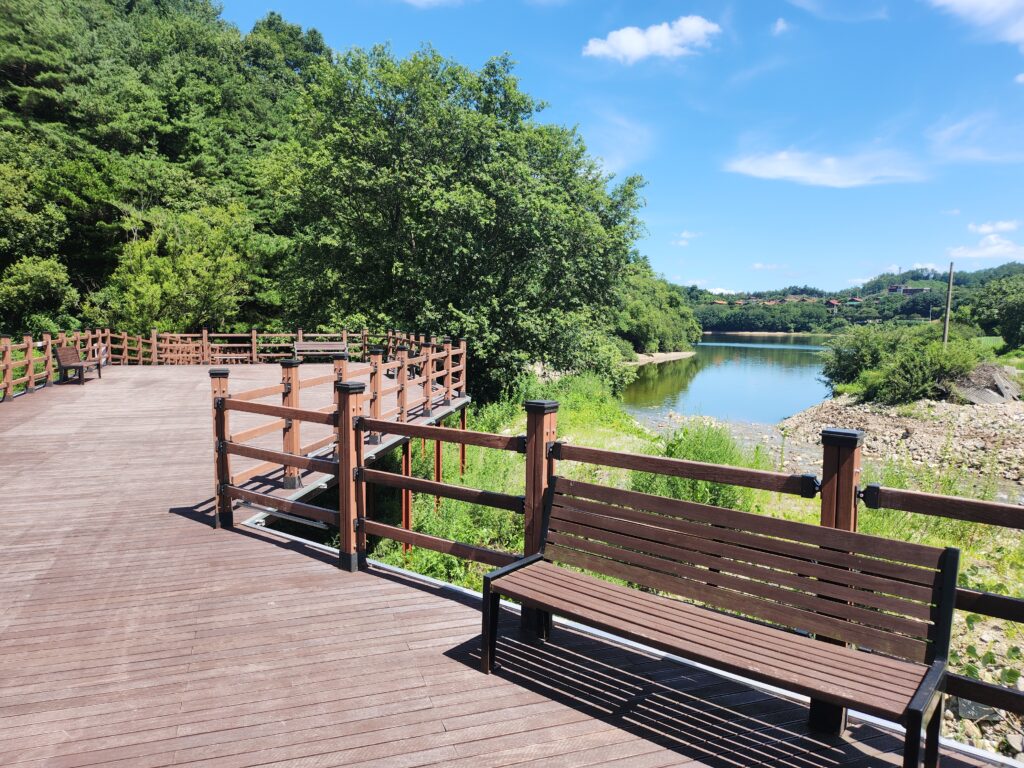 처음 만난 매력포인트는 광장인데, 앉을 수 있는 의자와 깔끔한 목조길이 잘 조성되어있었고 멀리서나마 순흥저수지의 멋진 뷰가 보이며 걸어갈 힘을 받을 수 있는 공간이었습니다. 걷기 시작 한 지 얼마 되지 않은 순간에 앉을 수 있는 자리를 본 것은 의외였지만, 의자를 바라보며 중간중간 쉴 수 있는 공간을 볼 수 있을 것 만 같았고 여유를 즐길 수 있을 것 같은 느낌이 들었습니다.