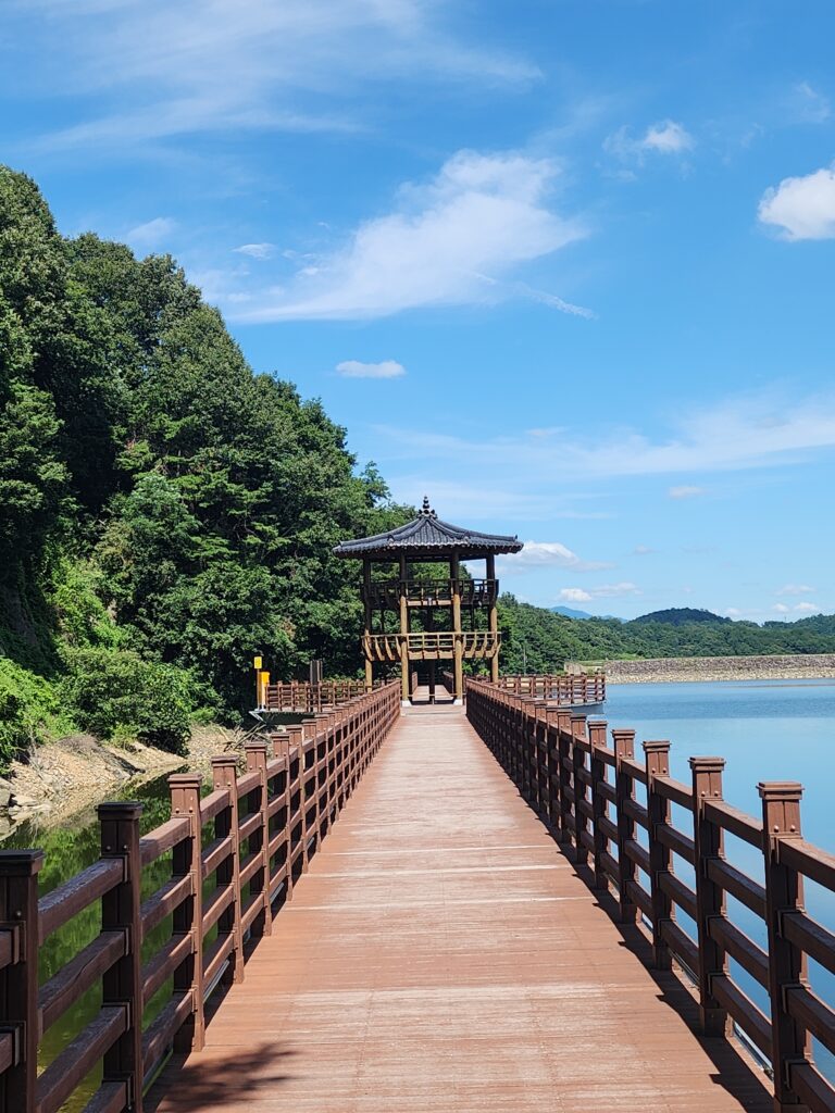 이 사진은 정자로 향하는 데크길, 그리고 정자 올라가서 볼 수 있는 순흥저수지 사진인데, 푸른 하늘이 그대로 비치는 하늘은 앞서 말했듯 우유니 사막을 생각나게 하고 발을 뻣으면 잔잔하게 물이 찰랑일 것 같은 아름다움을 경험할 수 있습니다.